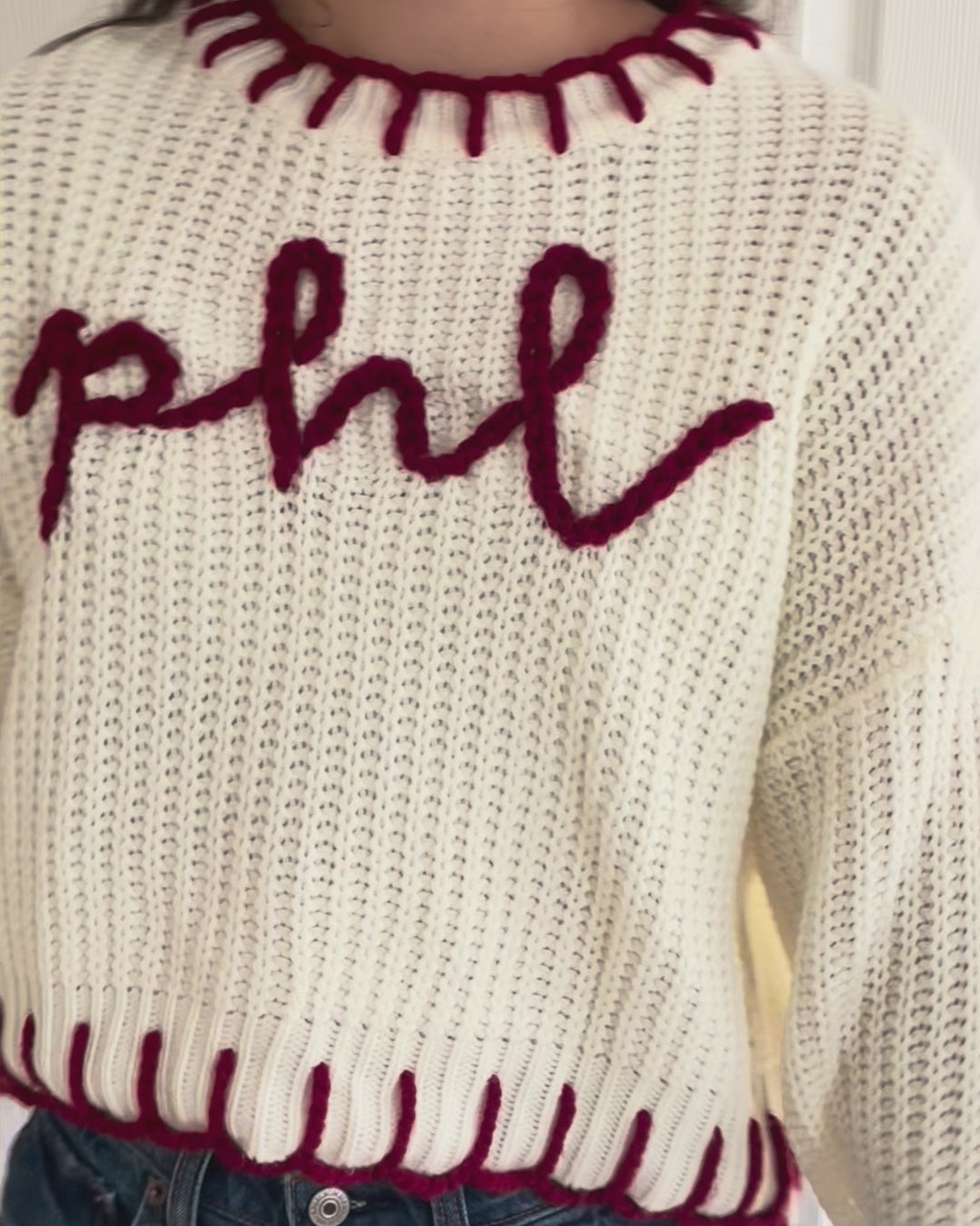 Show your city love in cozy style with the Philadelphia “phl” Knit Sweater. This cream-colored cropped pullover features bold red stitched detailing and a hand-embroidered “phl” script across the chest — a stylish nod to the heart of Philly. The chunky knit texture and relaxed fit make it the perfect blend of comfort and streetwear flair.